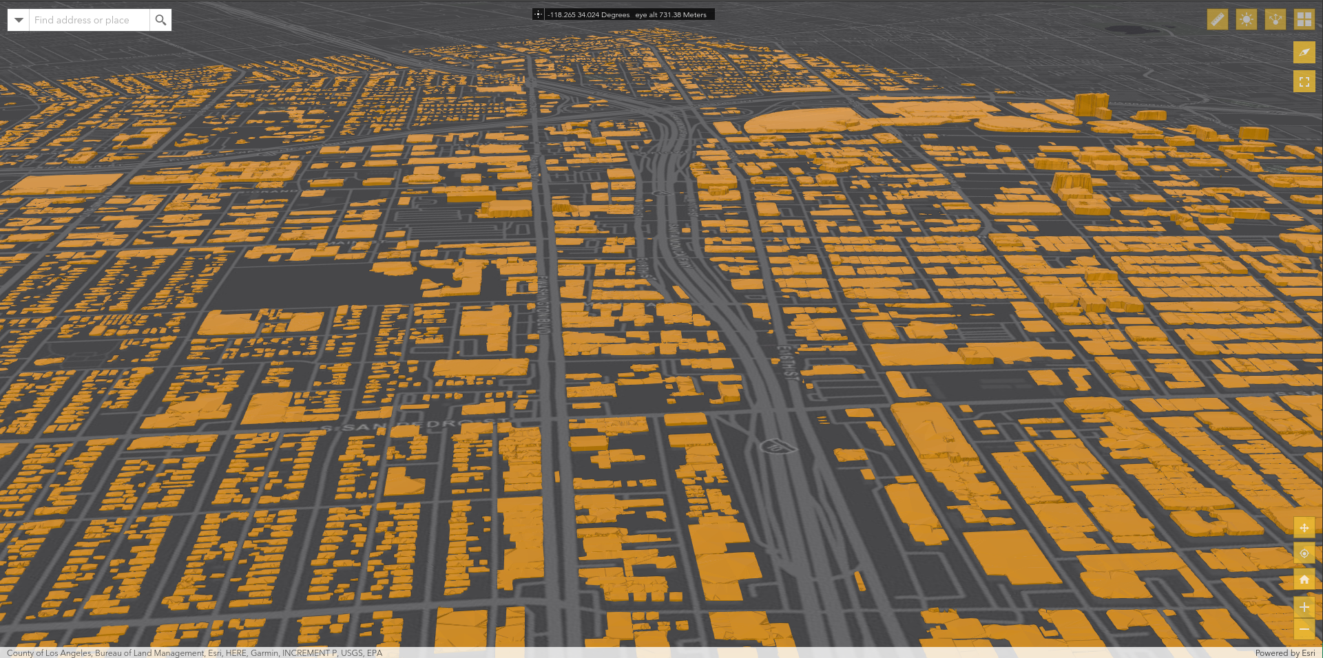 For my Lesson assignment I choose to employ the 3D building data in Los Angeles that I had created during my final project for GEOG: 485. The web app builder configuration options for web scenes is much slimmer than what is available for regular 2D web maps. As such the only custom widgets in the scene are a Basemap Selector (which doesn’t support removing specific basemaps), the measure tool, and a daylight shadows tool. The web scene interface also differs greatly from the web map interface, supporting fewer features like labeling or the pop-up configuration.