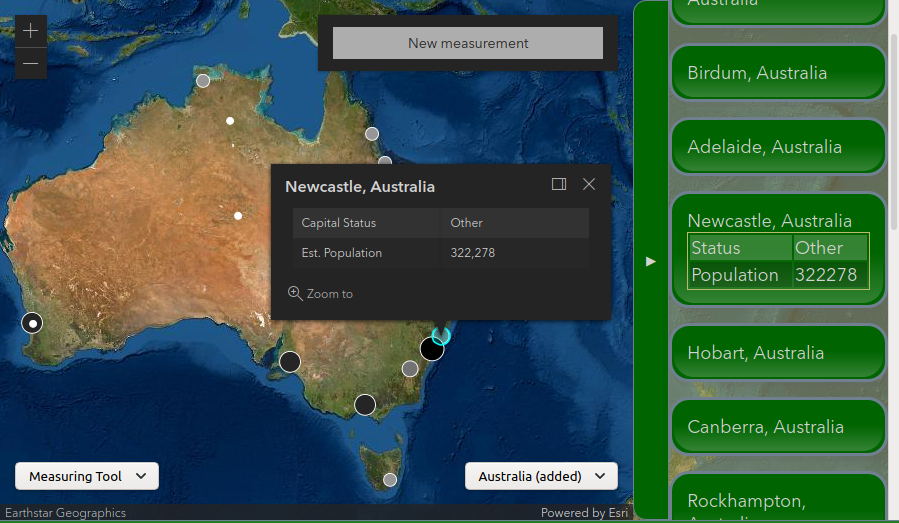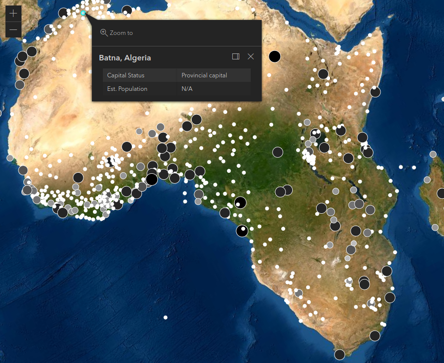 This map will display a window prompt asking the user to input the name of a continent. Behind the scenes the application will then query an ArcGIS Online continents feature service to get the geometry for the continent in order to perform a spatial query on a world cities feature service. The world cities which are returned from the query are symbolized according to the population size using a UniqueValuesRenderer. Once the world cities are loaded onto the map the view will pan and zoom to encompass those cities. An additional feature to this map is that it will verify your input to make sure you enter the name of a real continent. If the user fails to enter a valid input a prompt will displayed reminding the user of continent names.