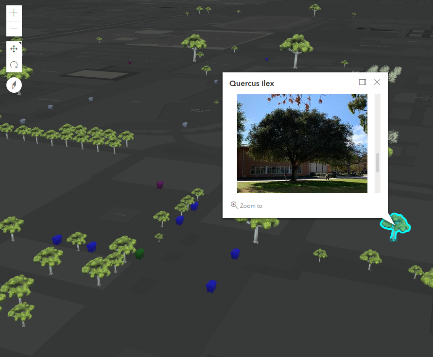 For the trees layer I again used a unique value renderer, this time changing the model rather than the color depending on the type of tree. I also employed the use of visual variables in order to change the height of the trees. For the popups on this layer I simply made use of the attachments content.