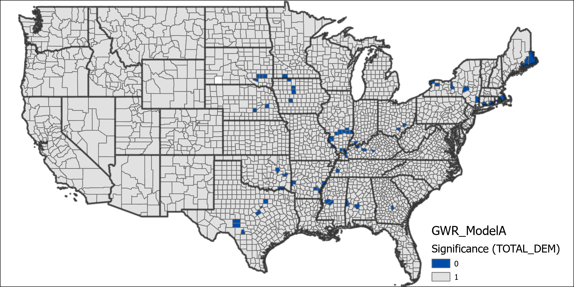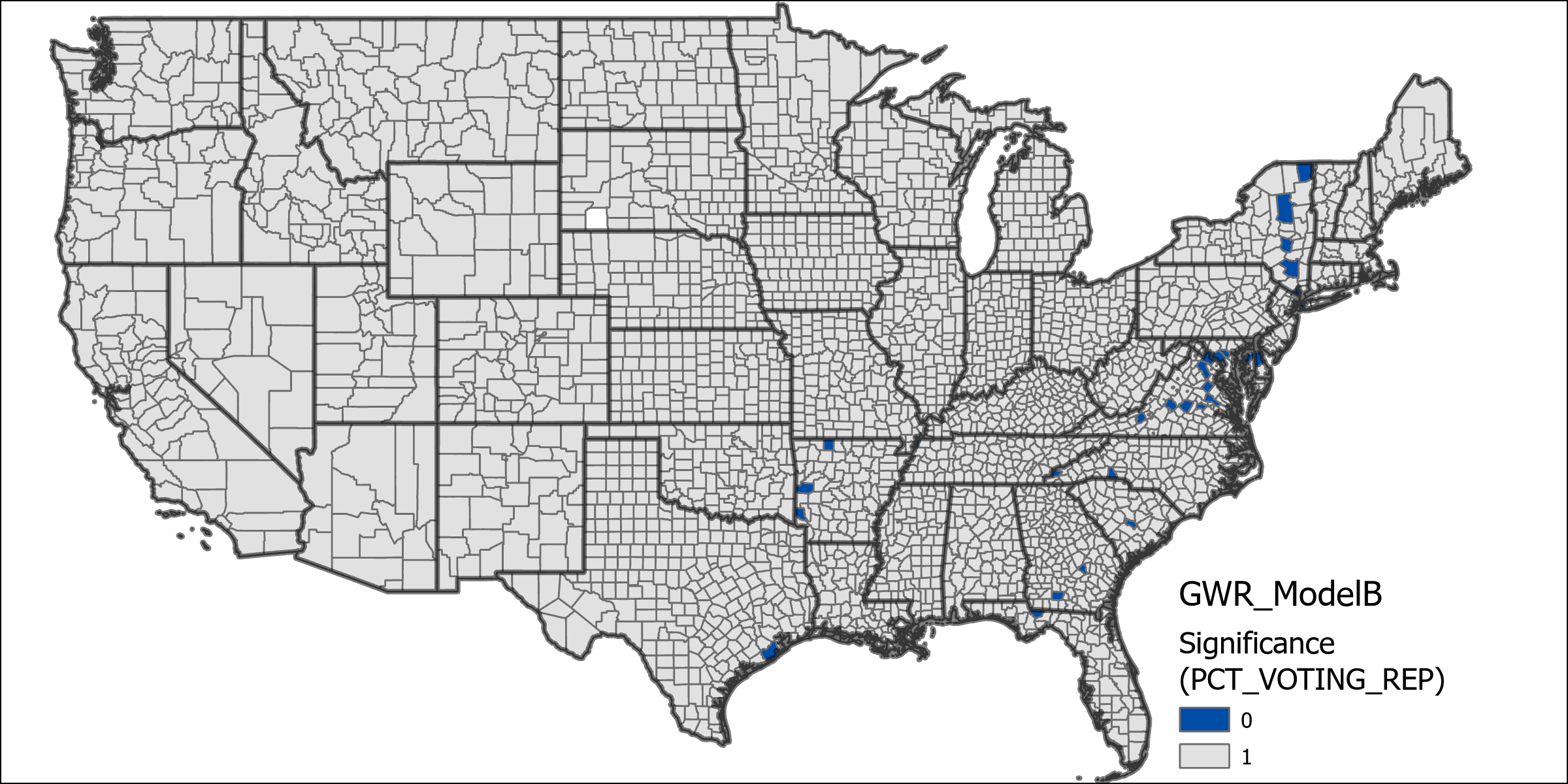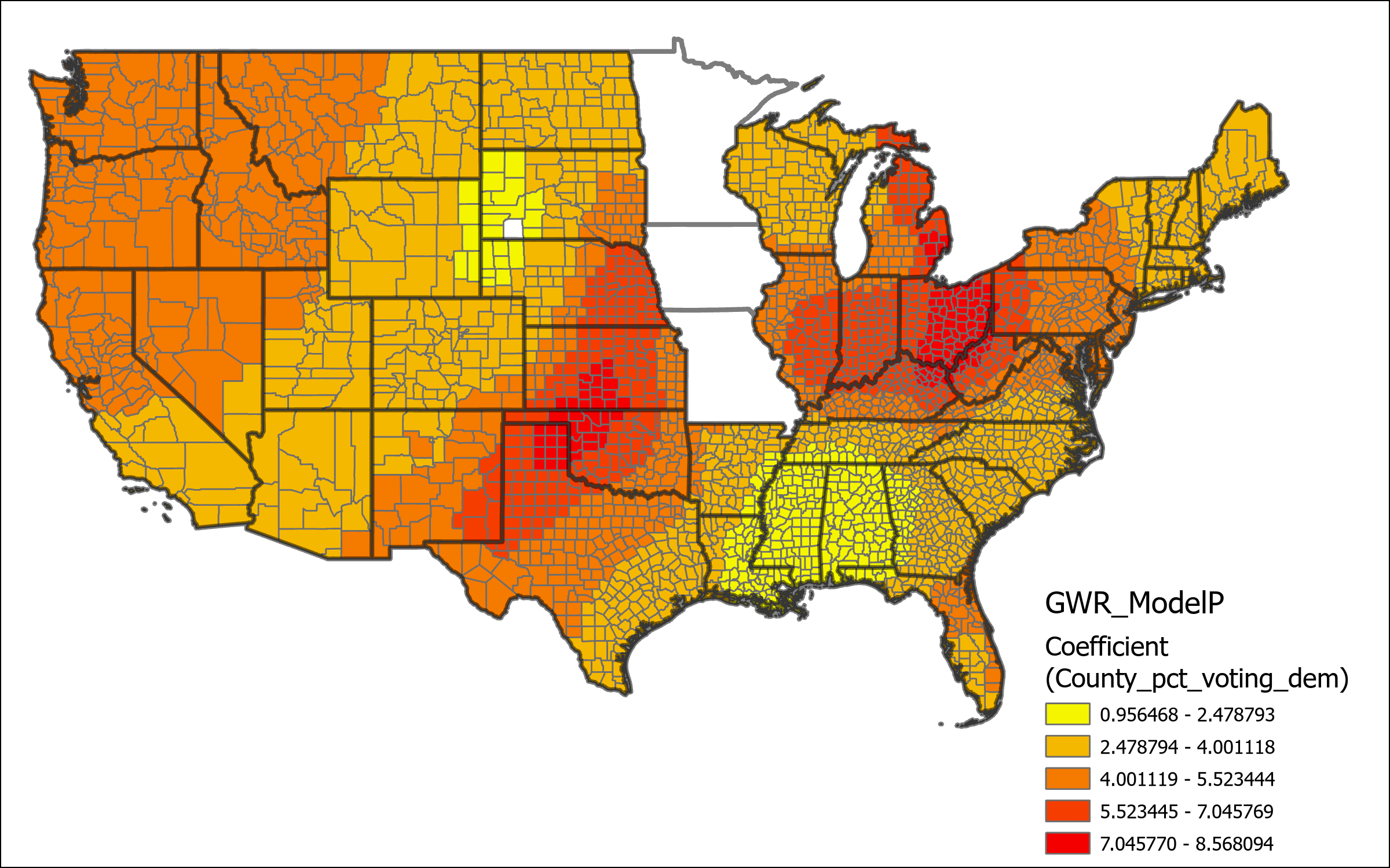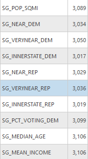 Overall I was not able conduct this research to the full extent that I had hoped, however I was still able to turn up interesting results. The lack of small unit data that could be easily connected to characteristics was a particular pain point for me trying to solve. One thing that didn’t work out the way that I had anticipated was the incorporation of distance measures, although I wanted to use fixed distances for the data, I hadn’t considered that it would make states unusable if they didn’t have sufficient neighbors at that distance level to draw upon. One way that I might now fix the distance grouping variable is to group based upon the nearest neighbors instead of a fixed unit. This would prevent any unit from not having any neighbors for the distance group. I was particularly interested by the possibility of differing scale migration flows accounting for Republican polarization, as it wasn’t really a result that I was anticipating before actually looking at the data that was returned. I learned a great deal about setting up variables for GWR analysis as well, I hadn’t intended to create more than one GWR model but I quickly discovered that I wasn’t going to be able to create an optimal model without first performing some different tests.