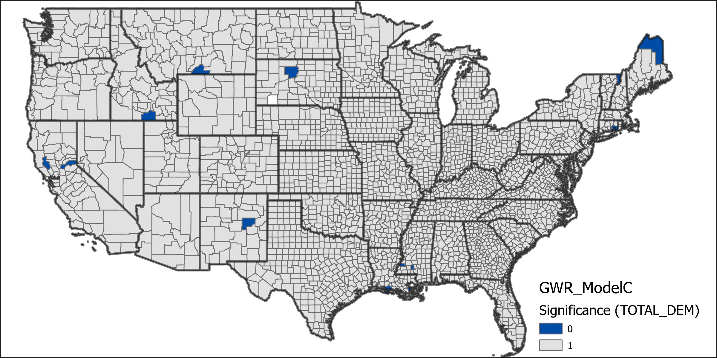 In model C only democrat voting percent is utilized because it is too closely related to the republican voting percentage (although there are votes for other candidates, they don’t make up a significant number), as such it can be reasonably assumed the addition would not affect this model much (it assumes that the republican voting percent is the inverse of democrat). Unsurprisingly the deviance explained by this model lies between Models A and B at 0.7852. Maps of significance for the variables tested by this model indicate high overall significance for all variables. The chart of coefficients has a diminished effect on state level migration counts compared to model A, while also exhibiting the enhanced effect of county level voting percentages from model B.