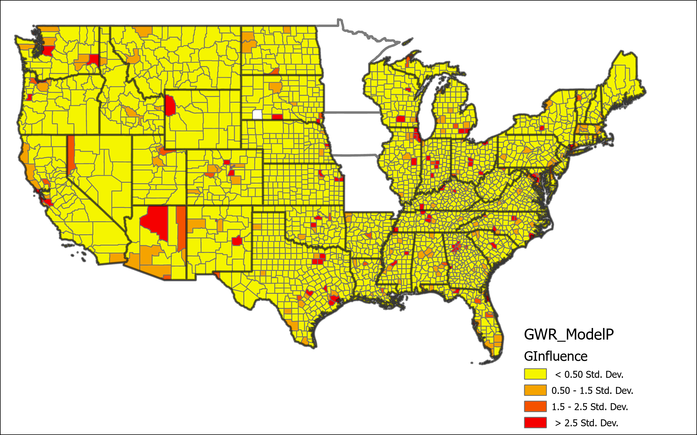 The map above represents the Local percent deviance from Model P. This shows the counties which are best predicted, or not predicted, using this model. There is clear lower levels of local percent deviance located predominantly in Southwest states, and also in the Dakotas and the coastal border of Virginia and North Carolina. Other geographic areas represent a much higher degree of certainty, a significant portion even around 90% local deviance explained by the model. Based on this result we can determine determine that this model is likely missing some key variables that would give better explanation for the deviation in the low percentage areas. Further the map of Geographic Influence below shows what appears to be a random distribution of high and low values across the country, indicating that local estimations are well fit according to spatial variations within the global model.