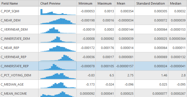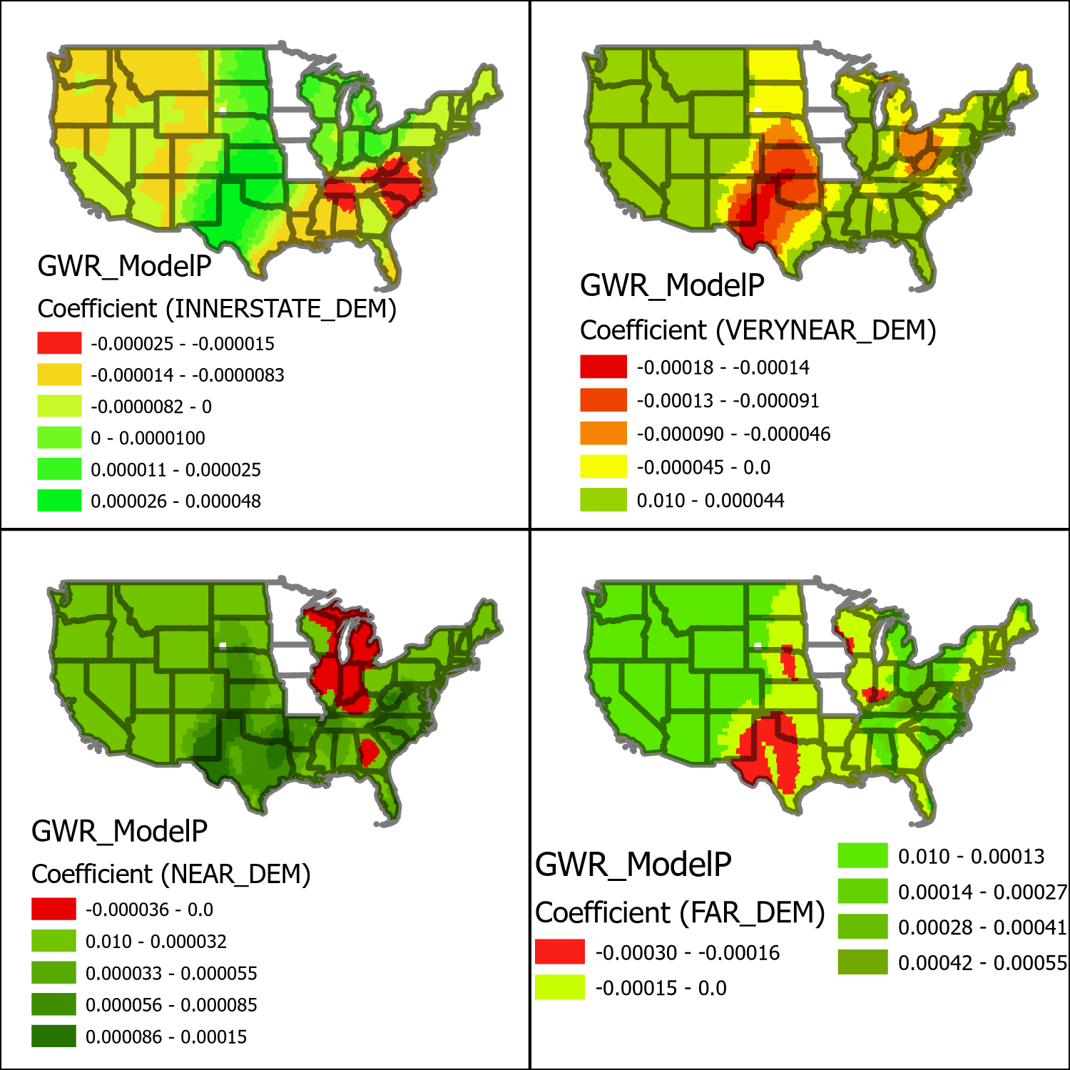 From these maps some interesting patterns start to emerge. For starters each variable seems to have a geographically distinct profile separate from the other variables. These variables also have the interesting characteristic that they flip from negative (red-yellow) to positive (green) values depending on the geographic context. The negative coefficient areas indicate that greater levels of migrants coming from democratic voting counties results in fewer of those immigrants moving to the county, presumably this is explained by greater positive relationships to the other distance variables. The innerstate map a distribution of efficacy that seems to be very closely related coefficient model for county voting percentages. The very near map on the other hand seems to be a nearly exact opposite from the interstate map, indicating that very near migration accounts for the majority of deviance that innerstate migration does not. The near and far migration maps seem to be more generally positive indicating that there is generally very little interference in explained deviance from the other two closer distance groups on these two farther categories.