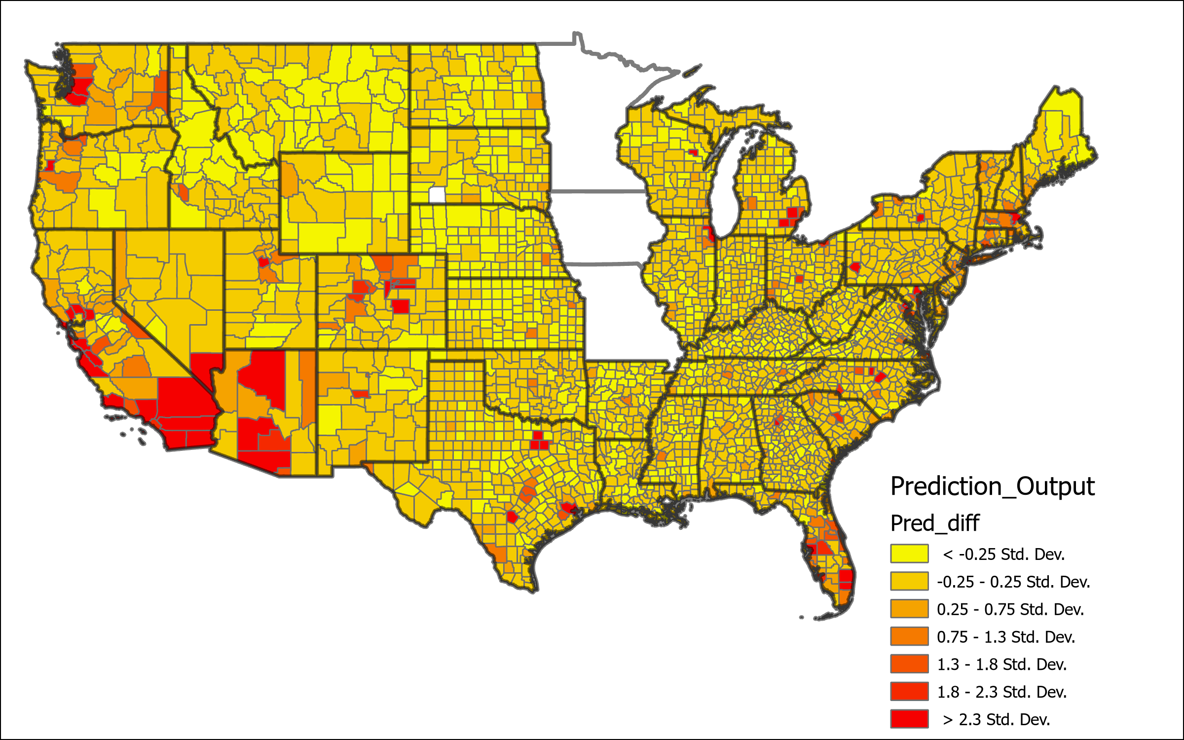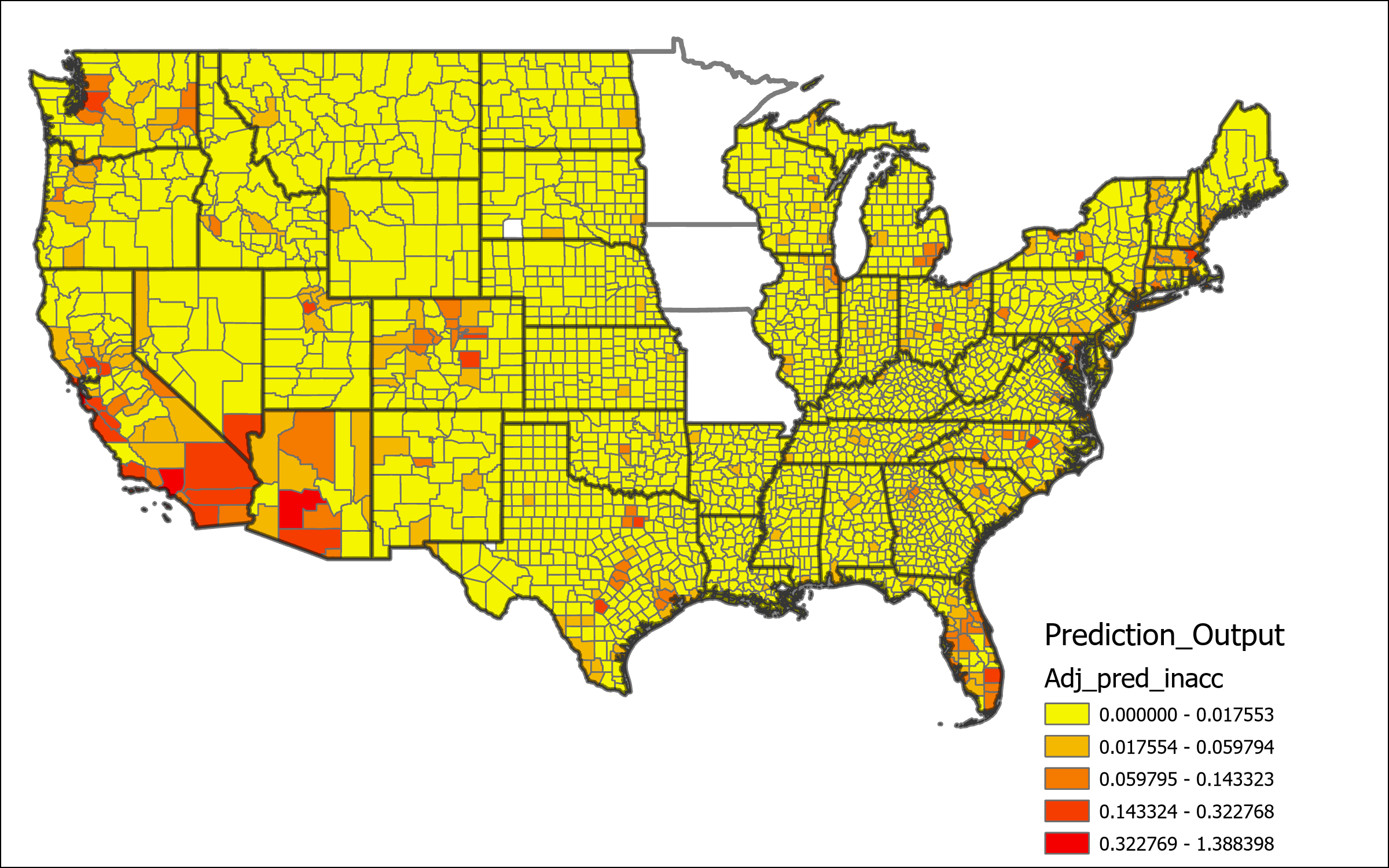 In the scatterplot above the relationship between the actual migration values and the predicted values computed by the model can be examined. The green line represents a one to once relationship between predicted and actual values, the values closest to this line are the most accurate. The gray line represents the actual trend line of the scatterplot data. The R2 value is only 0.56 indicating a that model tends to heavily under predict the values. Looking at the individual counties from the prediction analysis it can be determined that there is generally decent levels of accuracy when using the adjusted inaccuracy, with the exception of only a small number of outliers that have values above 0.2, highlighted in the table below. These outliers are very spatially clustered and are representative of the same areas where the regression model has the lowest values for explained deviance. This is unsurprising as these areas should be to have the highest degree of inaccuracy. Filtering these outliers from the data produces a much tighter scatter plot and a more accurate trend line, although there is still a tendency in the model to underpredict values.