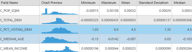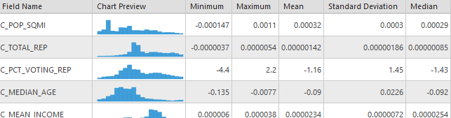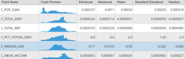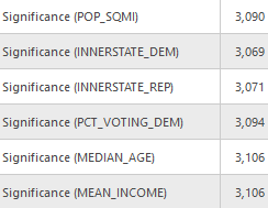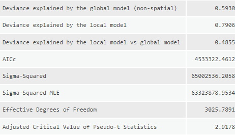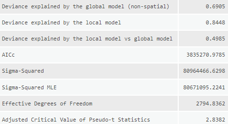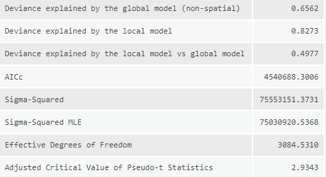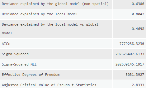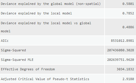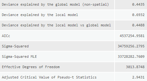 For the other tool inputs I used the same settings across the models to ensure that they could be compared equally. The dependent variable is a count of total migration, as such the model type selected was “Count” which utilizing a Poisson based local weighting scheme. For the neighborhood type I selected number of neighbors so that I could utilize the Golden search neighborhood selection method in order to minimize the AIC values for each model, although they won’t be compared with each other as the dependent value is different in most models. There is some degree of local colinearity introduced to the models due to utilizing state aggregated statistics (counties will have the same values as other nearby counties in the same state) so I need to ensure that the number of neighbors is sufficiently high to incorporate counties from other states. I settled on a min-max neighborhood range of 80-600 to balance the need for large numbers and available computational power. A local Gaussian weighting scheme is used so county estimates may have an impact outside of their neighborhood range.
