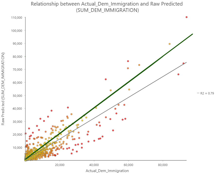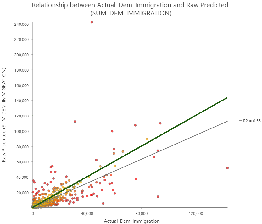 Given the highly variable and geographic nature of migration data, especially at scale, typical linear regression models that do not take into account spatial variation are not going to be sufficient to represent the values at local units. Additionally since we are not dealing with individual level units it makes traditional multi-level analysis unpractical. This leaves the utilization of a Geographically Weighted Regression (GWR) model in order to predict the immigration count of counties. I use ESRI’s GWR python tool included with ArcGIS Pro in order to conduct this analysis.
